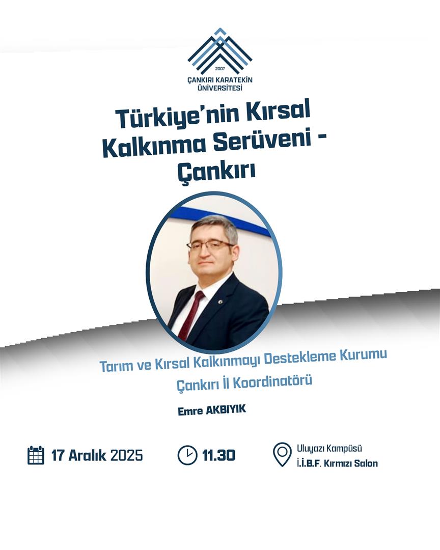 17.12.2025 saat 11.30`da bölümümüz öğrencilerine ve akademisyenlerine yönelik olarak Tarım ve Kırsal Kalkınmayı Destekleme Kurumu (TKDK) Çankırı İl Koordinatörü Emre AKBIYIK tarafından "Türkiye`nin Kırsal Kalkınma Serüveni- Çankırı" adlı bir konferans düzenlenecektir.